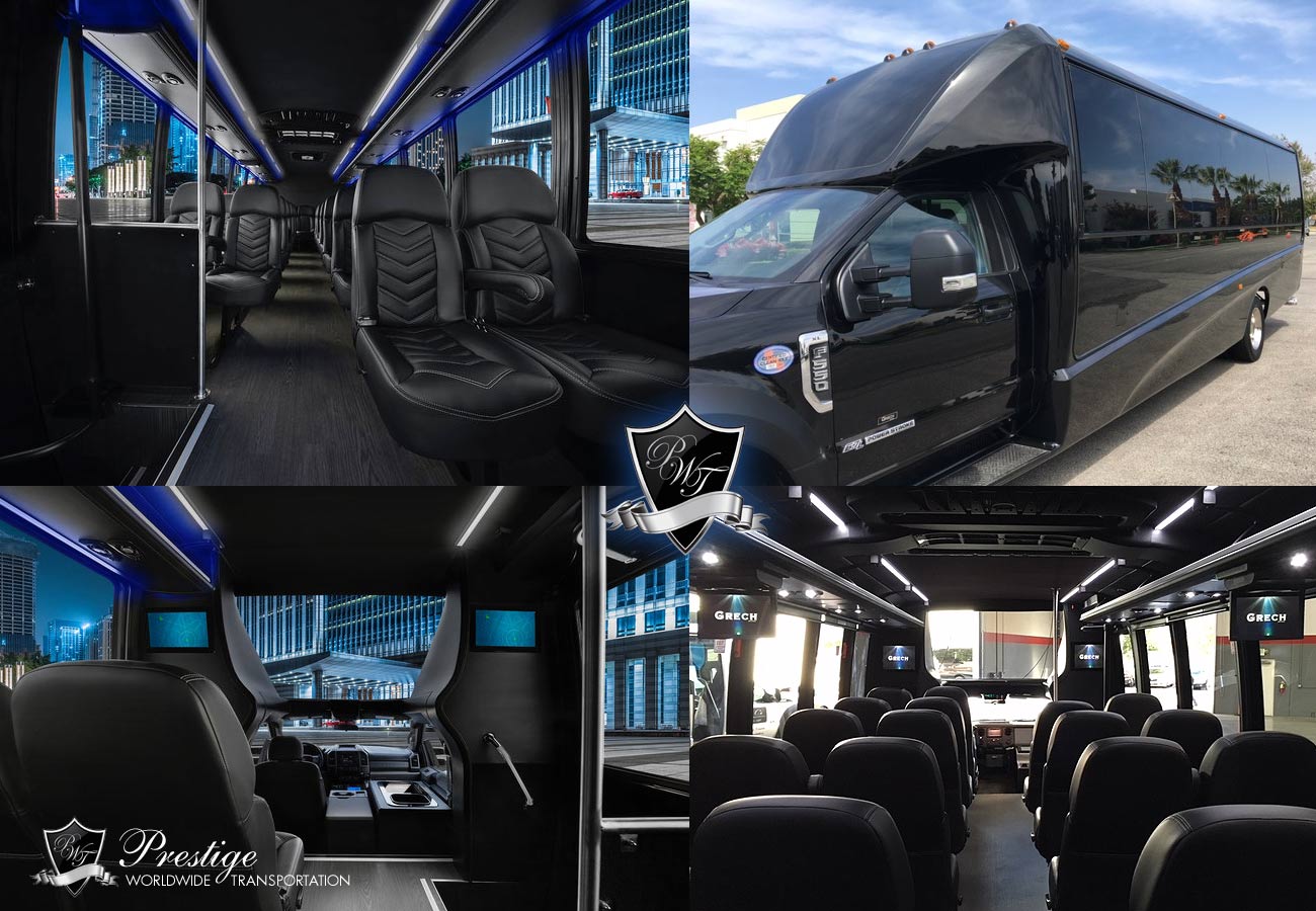 Features: Comfortable executive seating for up to 31 passengers, luggage area, Plush executive leather seating with arm rests, Comfortable leg room between seating, Panoramic front viewing window, Premium audio & media systems, Overhead reading lighting, Isle walkway LED lighting, Large luggage compartments, Overhead storage compartments, Powerpoint charging, High-powered HVAC air systems heating/cooling, Altro wood-look flooring, Passenger retractable seat belts & more!